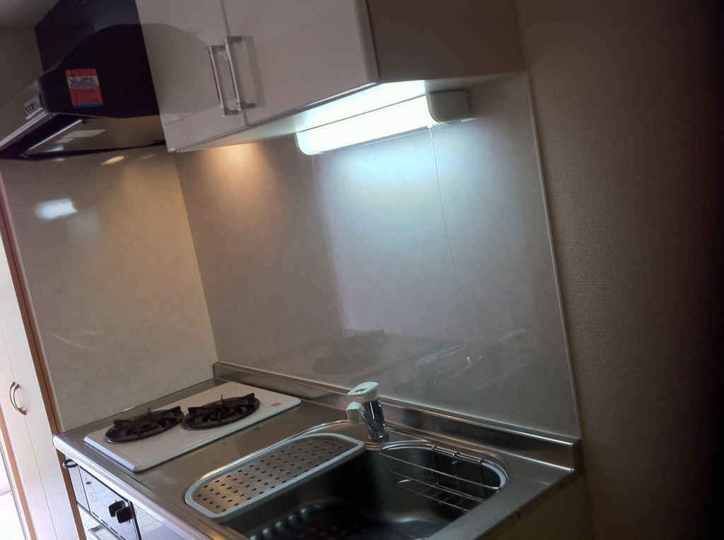 キッチンは、まぁ、最低限。2口ガス台、収納はまぁ、これだけあれば上等な方かな。
